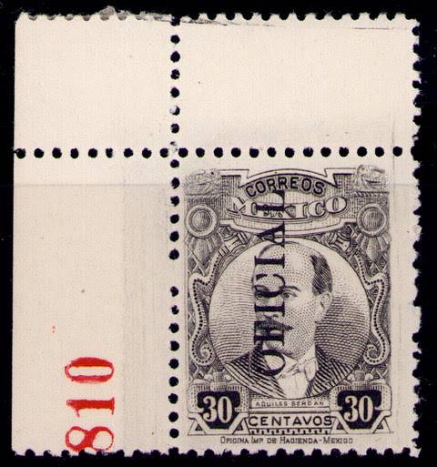 México “oficial” con número de placa en la orilla, de la emisión de 30 centavos con sobreimpresión vertical en negro.