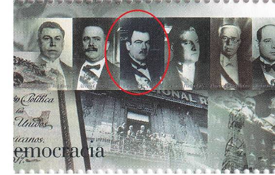 Y es en la hoja recuerdo del año 2000 titulada El siglo de la Construcción Democrática (SC#2180) (a), que consta de 5 estampillas (b), en donde Elías Calles aparece en la estampilla titulada La Senda de la Democracia (SC#2180a), a continuación (Fig.2) la presento ampliada pero parcial para apreciar mejor la imagen de Calles (observe el círculo rojo en la parte media superior).