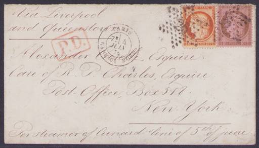 Este sobre, enviado en 1873 desde París, tiene un matasellos con estrella y el número 26 de una de las oficinas de correos..