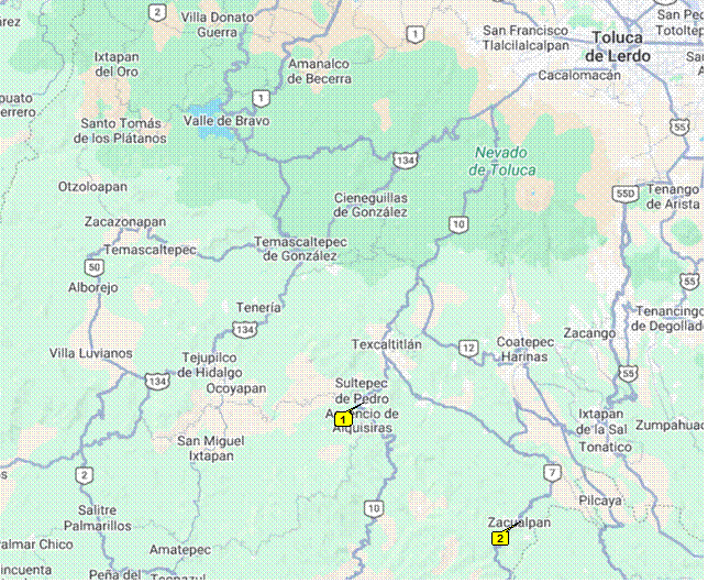 Distancia ( Kilómetros según Google Maps ): De Sultepec a: Zacualpan 55.