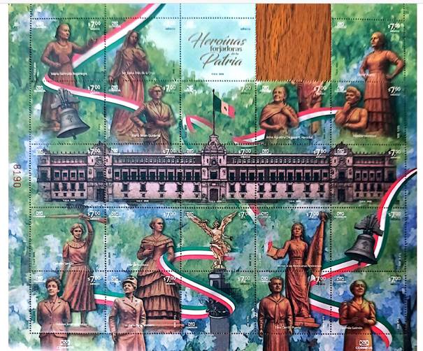 -14 estampillas, de las cuales 13 representan a mujeres con nombre y apellido que destacaron por su contribución a la Patria y 1 más es en Honor a las Mexicanas Anónimas (posición 19);